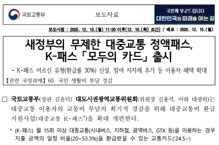 특히 K패스 이용을 전제로 설계된 모두의카드가 함께 출시되면서 신청과 이용 과정도 한층 간편해졌습니다. 교통 이용 실적을 따로 관리하지 않아도 자동으로 반영된다는 점에서, 제도를 꾸준히 활용하기에 부담이 적다는 장점이 있습니다.