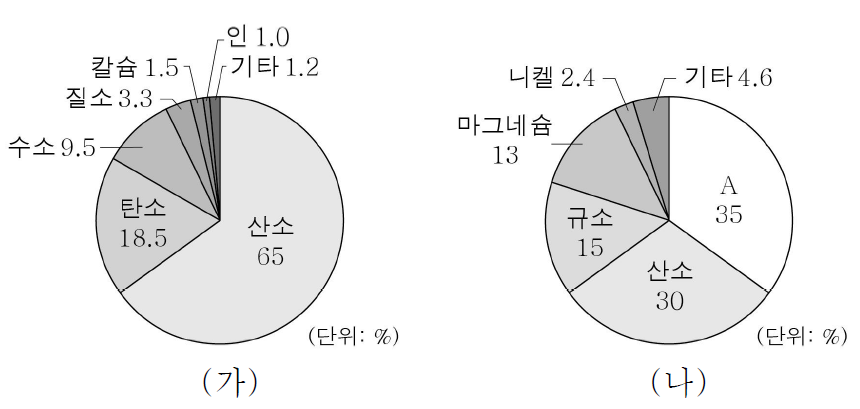 (나) 규소 마그네슘 등이 포함된 지구를 구성하는 원소의 질량비이며 이 중 질량비가 35%로 가장 큰 A는 철(Fe)입니다.