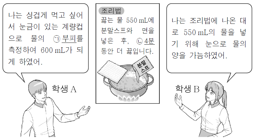 학생 B: 측정 도구를 사용하지 않고 눈으로만 물의 양을 대략 가늠하였으므로 이는 ‘어림’에 해당합니다.