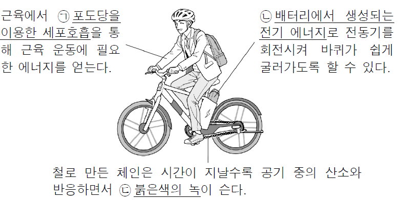 → O(전기 자전거를 운행할 때 배터리에 저장되어 있던 화학 에너지가 전기 에너지로 전환되어 모터를 회전시키므로 완벽히 올바른 설명입니다)