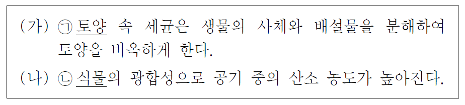 → X((나)는 식물(생물)이 대기 환경(비생물)을 변화시키는 현상입니다. 선지는 반대로 환경이 생물에게 주는 영향을 설명하고 있으므로 명백히 틀렸습니다)