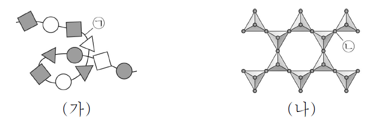 (나) 규산염 광물 Y: 지각을 구성하는 암석의 대부분을 차지하는 규산염 광물의 기본 단위체는 규산염 사면체(Si-O 사면체)입니다. 규산염 사면체는 중심에 규소(Si) 원자 1개가 있고 모서리에 산소(O) 원자 4개가 위치하는 정사면체 구조입니다. 따라서 바깥쪽에 위치하여 이웃한 사면체 간 결합 시 서로 공유되는 ㉡은 산소(O)입니다