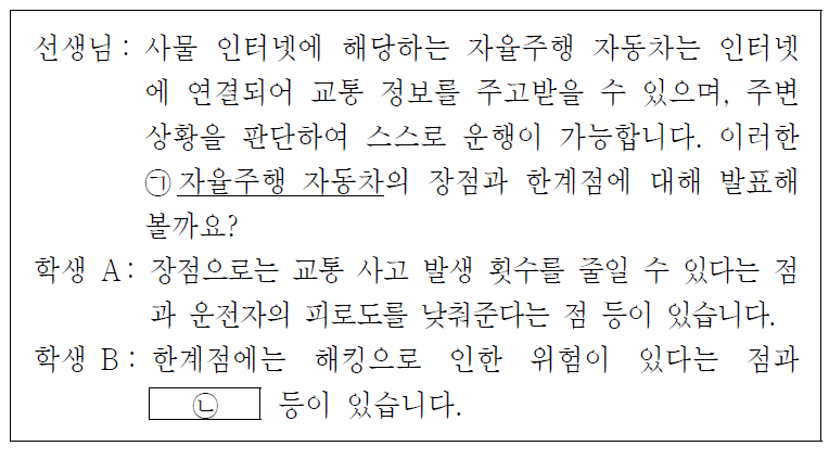 선생님: 사물 인터넷(IoT)과 연결되어 정보를 주고받으며 스스로 상황을 판단하는 ㉠자율주행 자동차를 언급하고 있습니다.