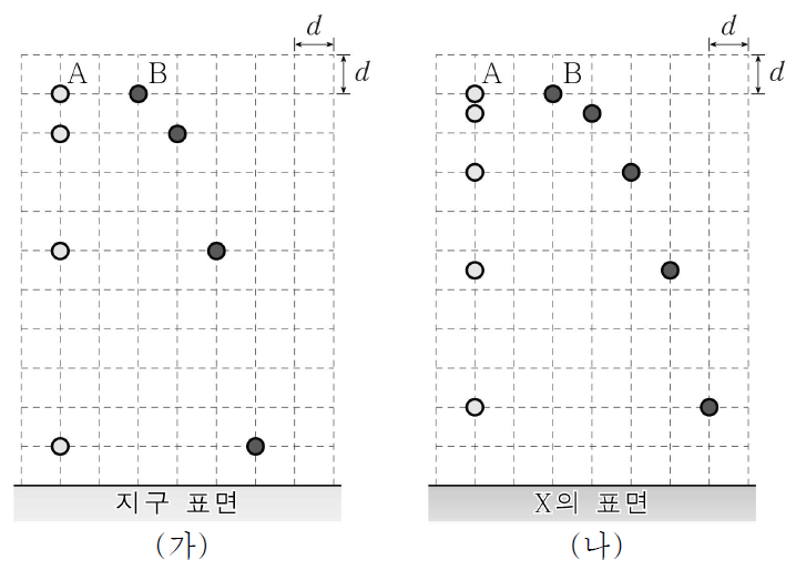 13. 그림 (가), (나)와 같이 지구와 미지의 행성 X에서 운동하는 물체 A와 B의 위치를 1초 간격으로 나타내었다. A는 가만히 놓았고, B는 수평 방향으로 던졌다. 이에 대한 옳은 설명만을 <보기>에서 있는 대로 고른 것은? (단, 물체의 크기와 공기 저항은 무시한다.)