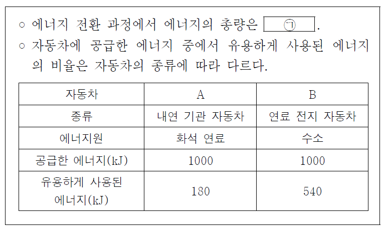 이 문항은 자동차 운행 시 발생하는 에너지 전환 과정과 에너지 효율 개념을 묻고 있습니다. 에너지가 다른 형태로 전환될 때 새롭게 생겨나거나 소멸되지 않으므로 에너지의 총량은 항상 일정하게 보존됩니다. 따라서 빈칸 ㉠에는 '일정하게 보존된다'가 들어가야 올바릅니다. 표에서 자동차 A는 화석 연료를 사용하는 내연 기관 자동차이며 자동차 B는 수소를 사용하는 연료 전지 자동차입니다. 두 자동차에 공급된 에너지는 1000kJ로 동일하지만 유용하게 사용된 에너지는 A가 180kJ이고 B가 540kJ로 다르게 나타납니다.